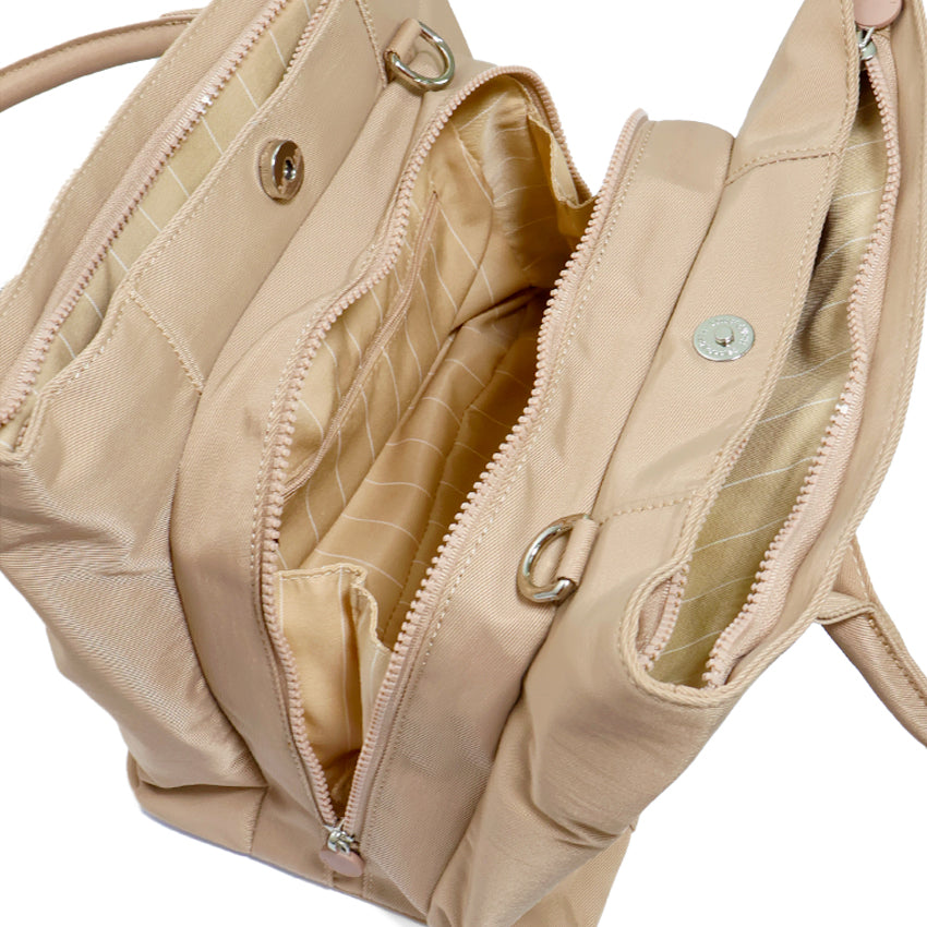- BODY: Water resistant Nylon Satchel bag with triple zip closures