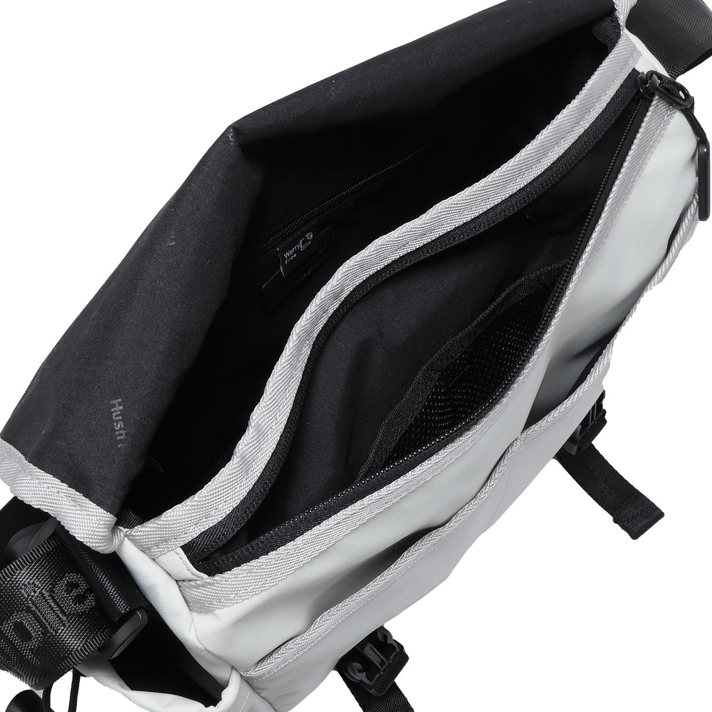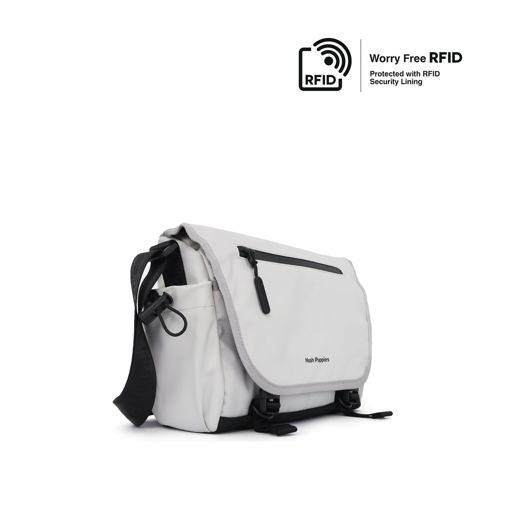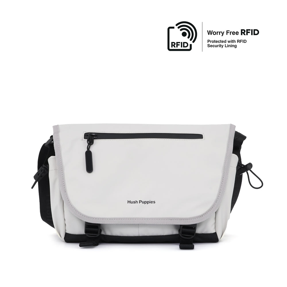 INNER: - Fastening buckle flap closure Exterior front and back zip front slip and side drawstring closure slip pockets Interior zip and slip pockets RFID compartment, Adjustable shoulder strap
