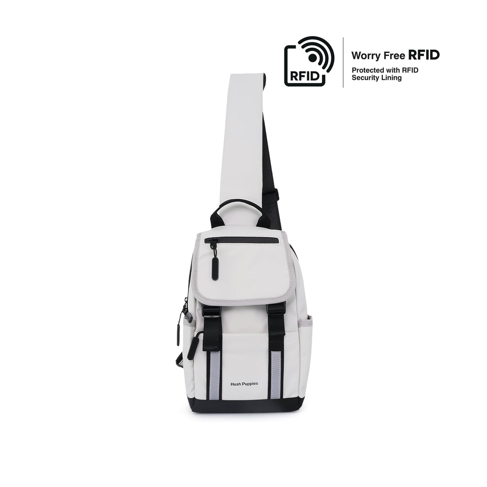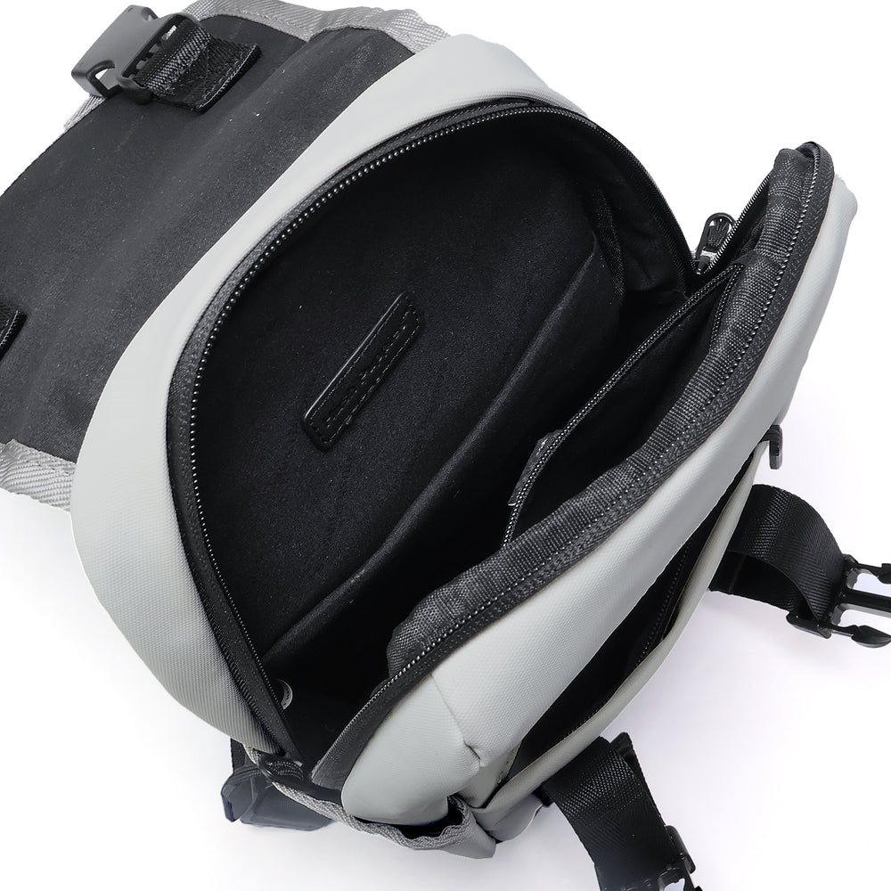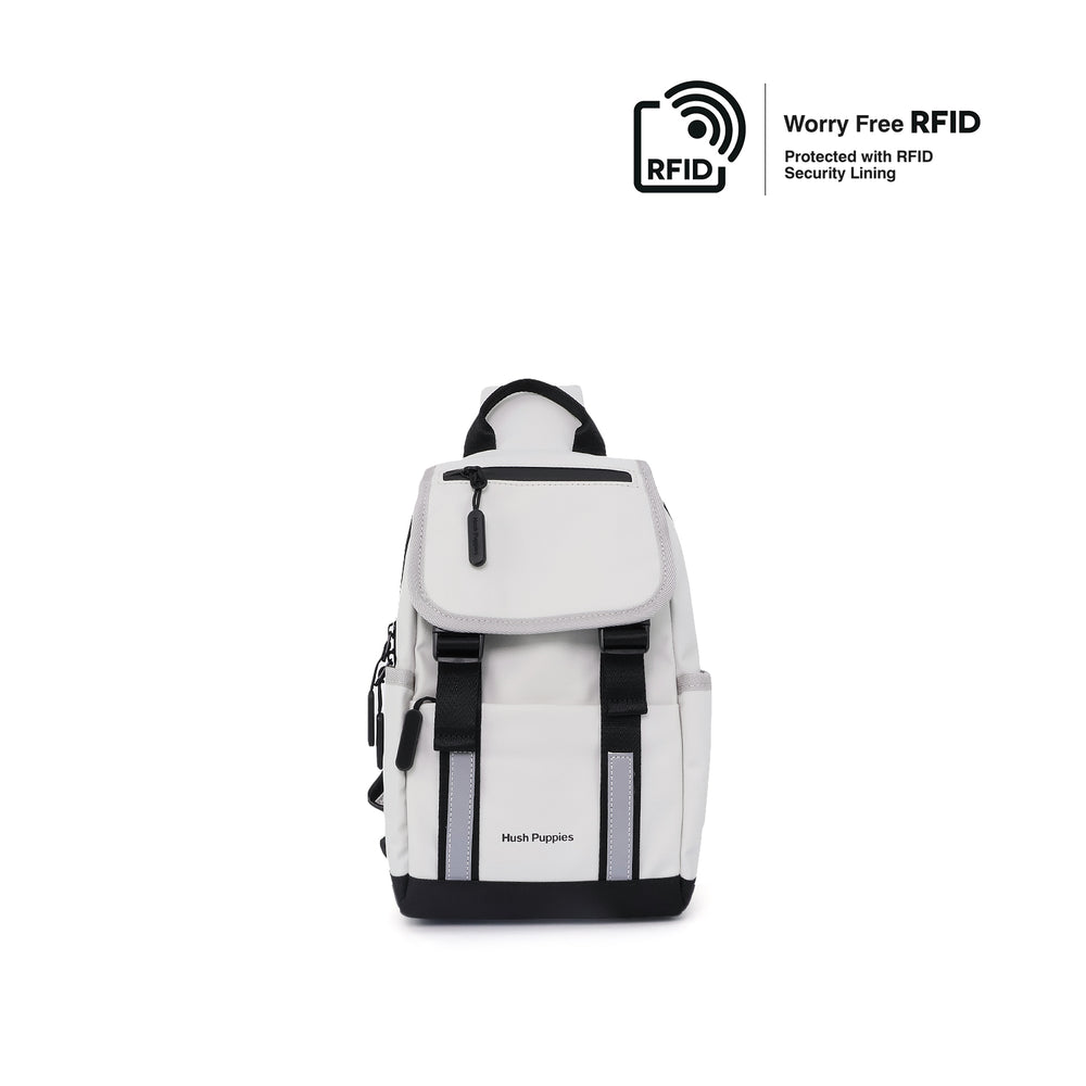 INNER: - Top carry handle, Fastening buckle flap and zip closure                                                Exterior front and back zip, side slip pockets                                                                              Interior zip and slip pockets                                                                                                        RFID compartment, Adjustable shoulder strap
